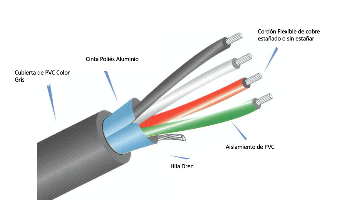 Conductores de cobre suave en construcción flexible tipo calabrote,aislamiento individual de PVC-LS e identificados por códigos de colores,blindaje a base de cinta poliester aluminio más malla de cobre estaño y cubiertos exterior de PVC.